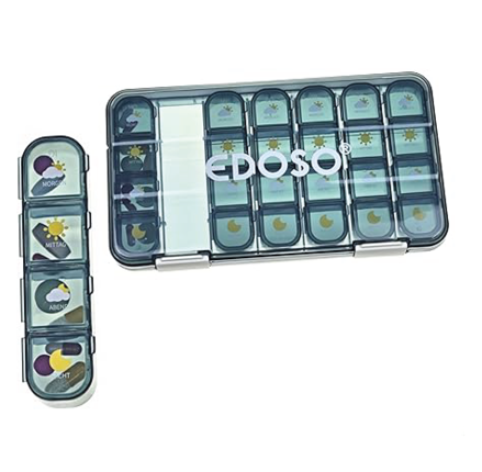 - 7 zásobníků na léky, každá se 4 přihrádkami – dávkovač léků se 7 prostornými nádobkami, každá nádobka má 4 velké přihrádky označené piktogramem a popisem (ráno, v poledne, večer, v noci), každá přihrádka pojme až 14 tablet velikosti aspirinu